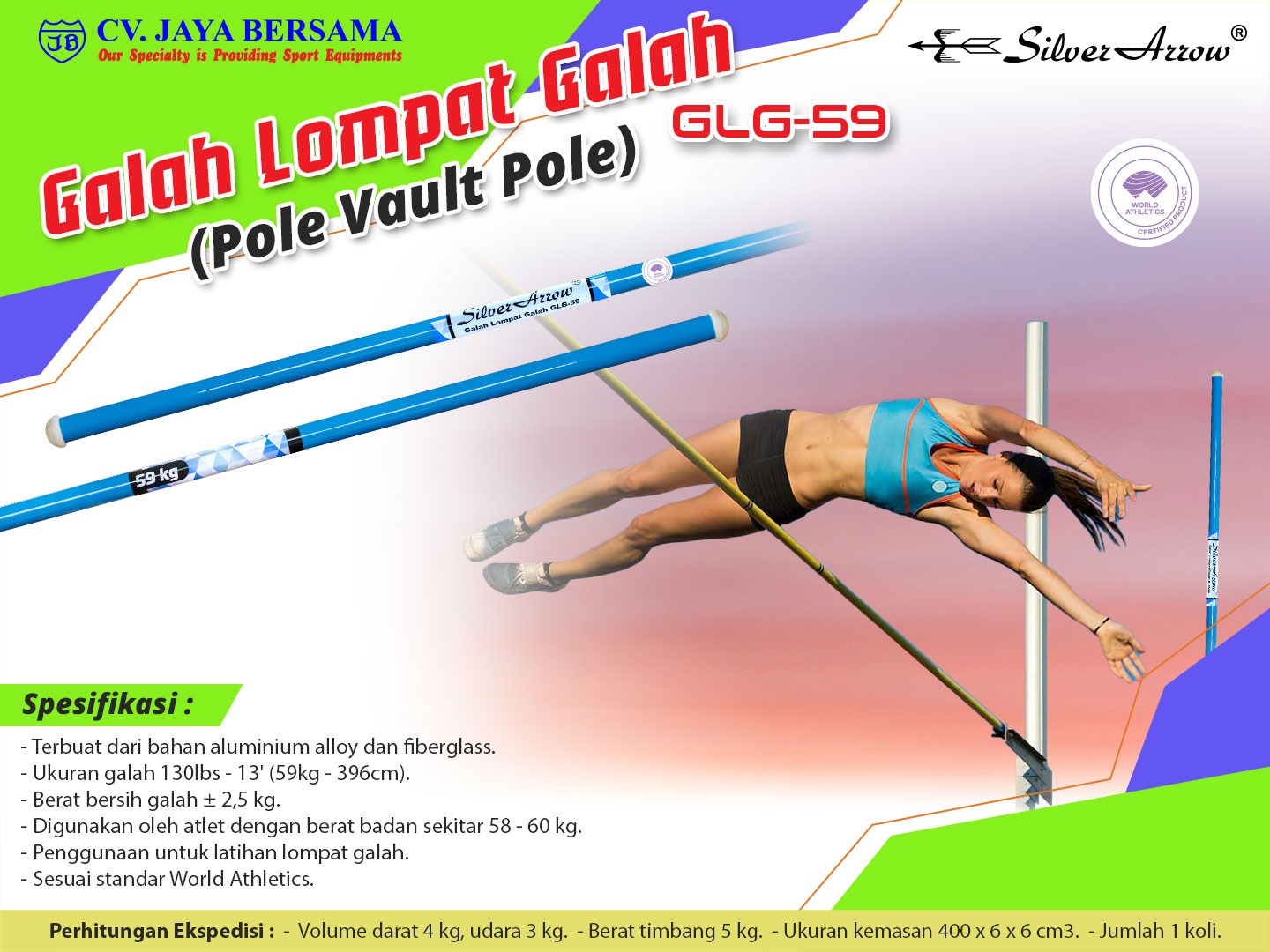 Spesifikasi Galah Lompat Galah GLG-59 (Pole Vault Pole) merek Silver Arrow sebagai berikut :