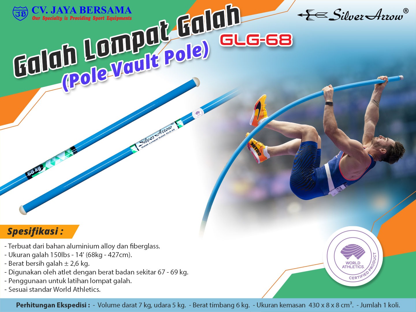 Spesifikasi Galah Lompat Galah GLG-68 (Pole Vault Pole) merek Silver Arrow sebagai berikut :