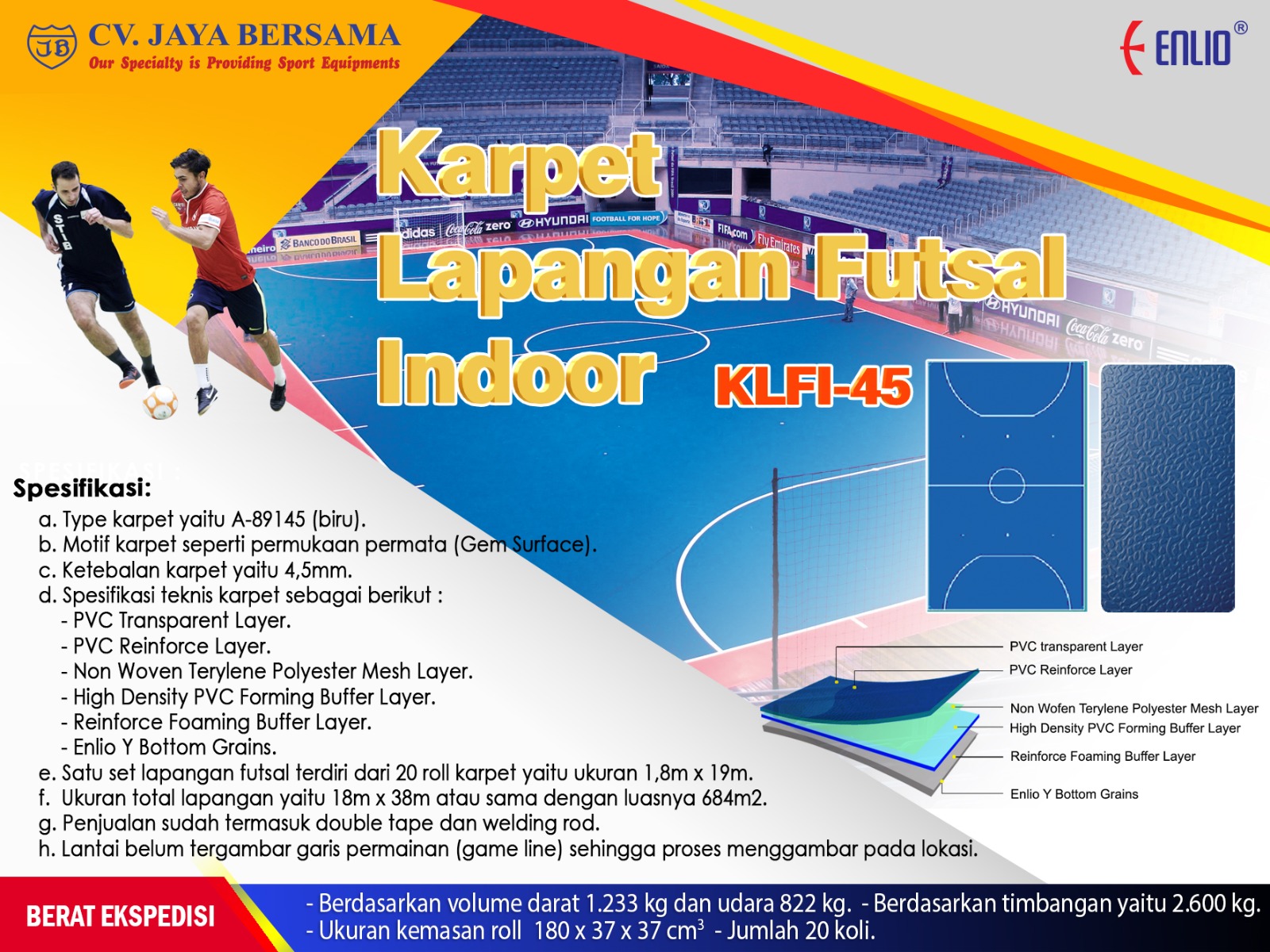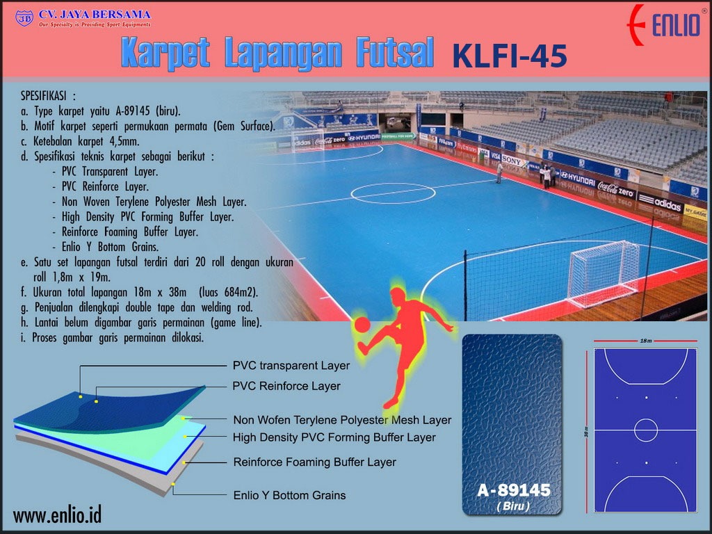 Spesifikasi Karpet Lapangan Futsal Indoor KLFI-45 merek Enlio sebagai berikut :