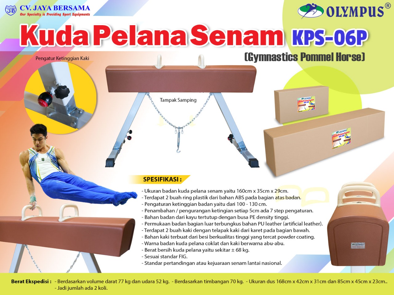 Spesifikasi Kuda-Kuda Pelana Senam KPS-06P (Gymnastics Pommel Horse) merek Olympus sebagai berikut :