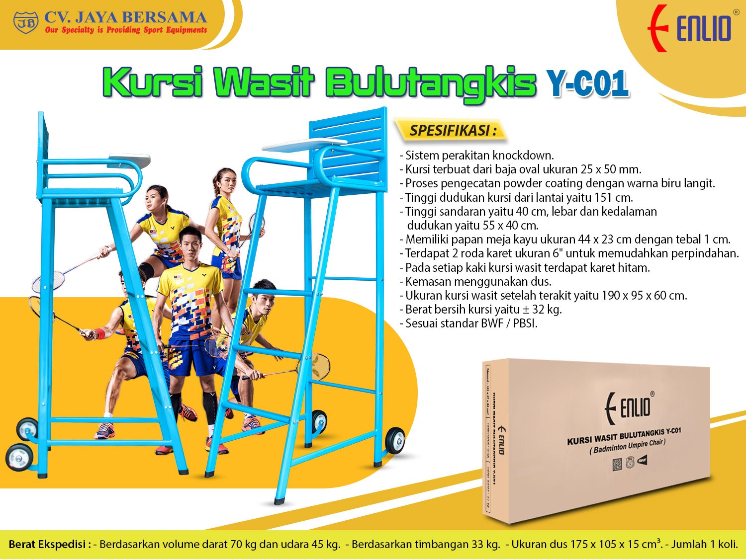 Spesifikasi Kursi Wasit Bulutangkis Y-C01 merek Enlio sebagai berikut :