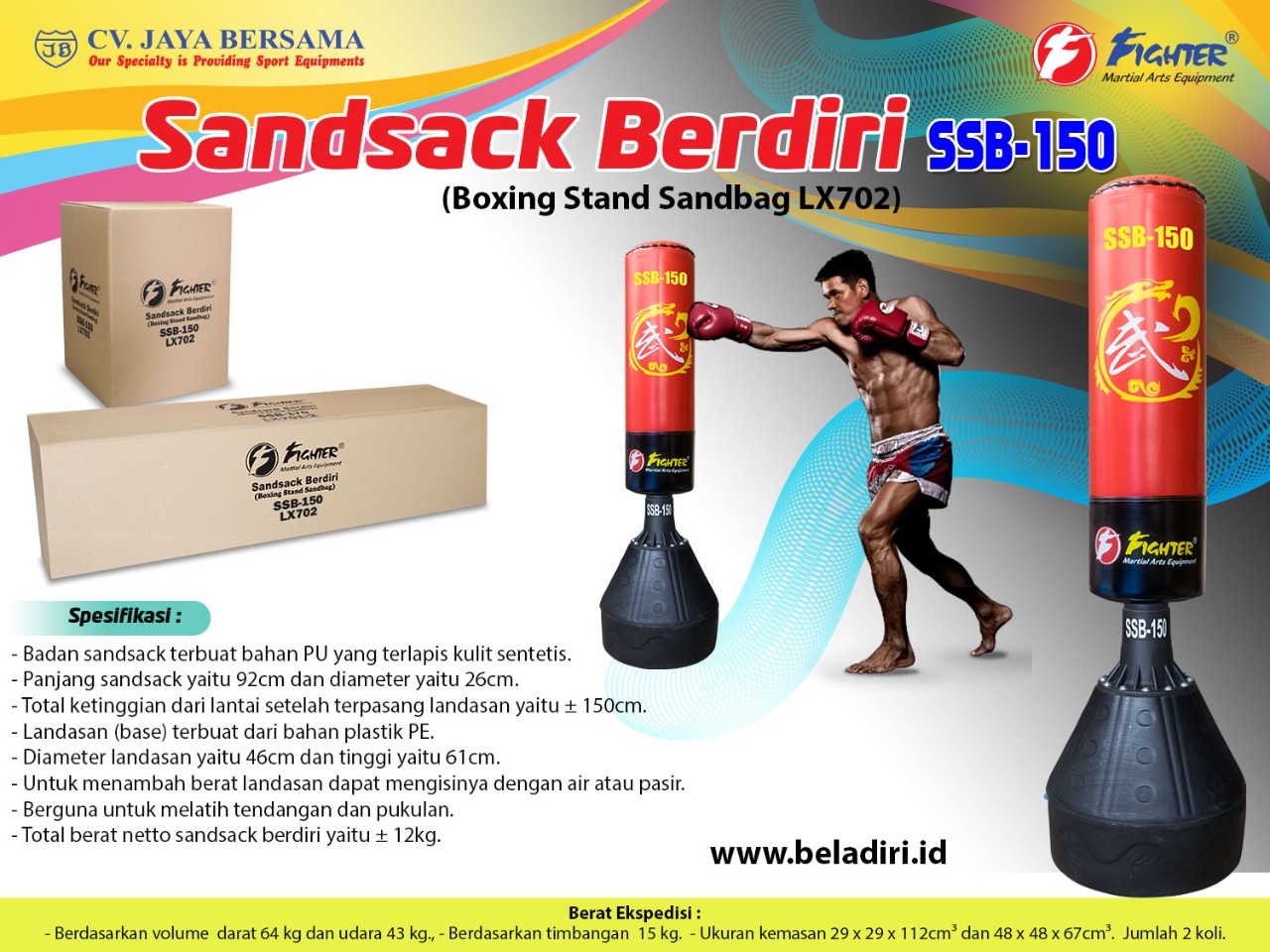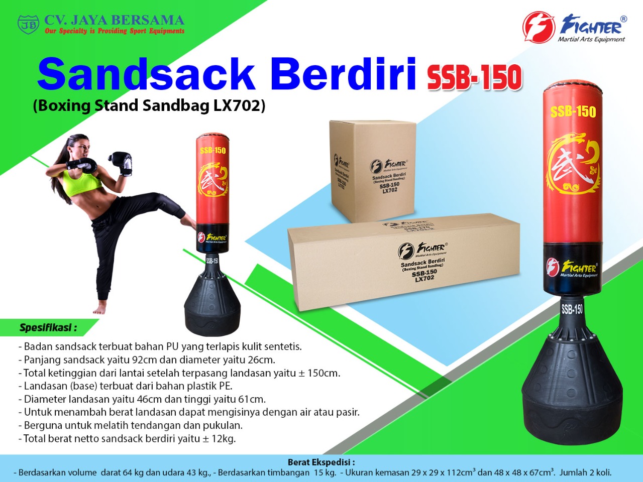 Spesifikasi Sandsack Berdiri SSB-150 (Boxing Stand Sandbag LX702) merek Fighter sebagai berikut :