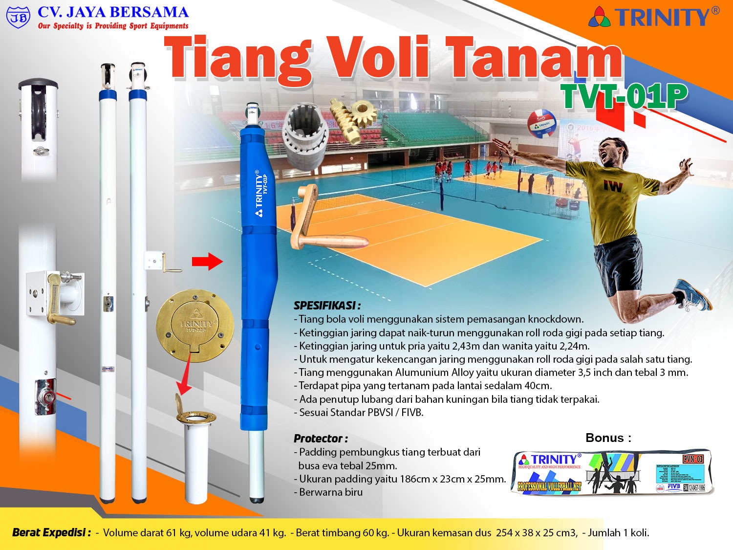 Spesifikasi Tiang Bola Voli Tanam TVT-01P merek Trinity sebagai berikut :