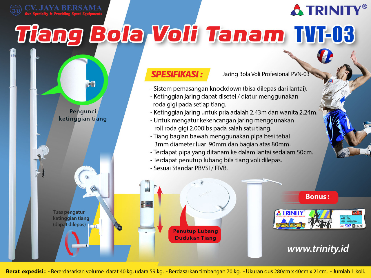 Spesifikasi Tiang Bola Voli Tanam TVT-03 merek Trinity sebagai berikut :