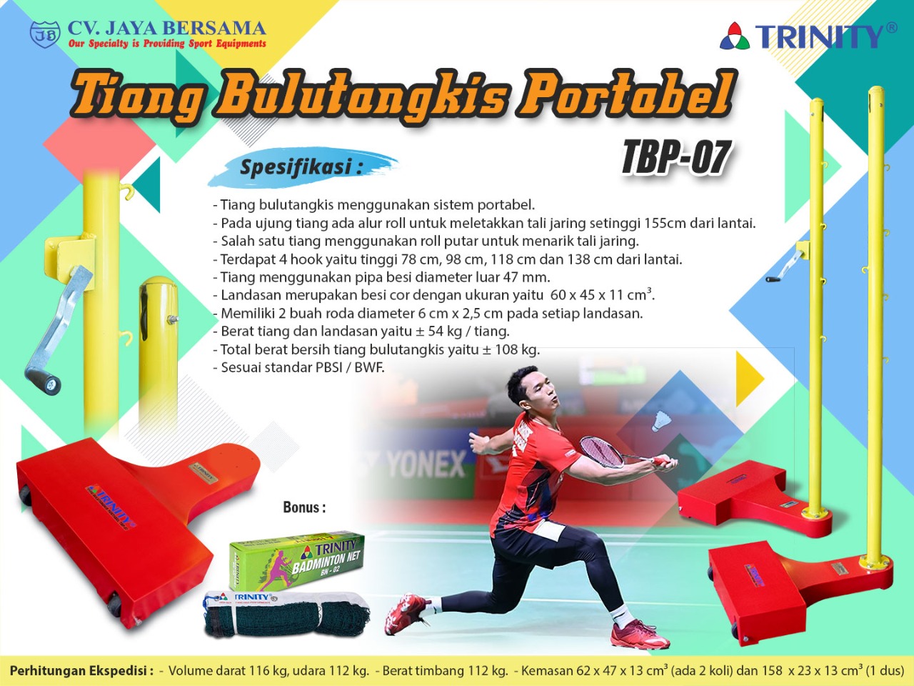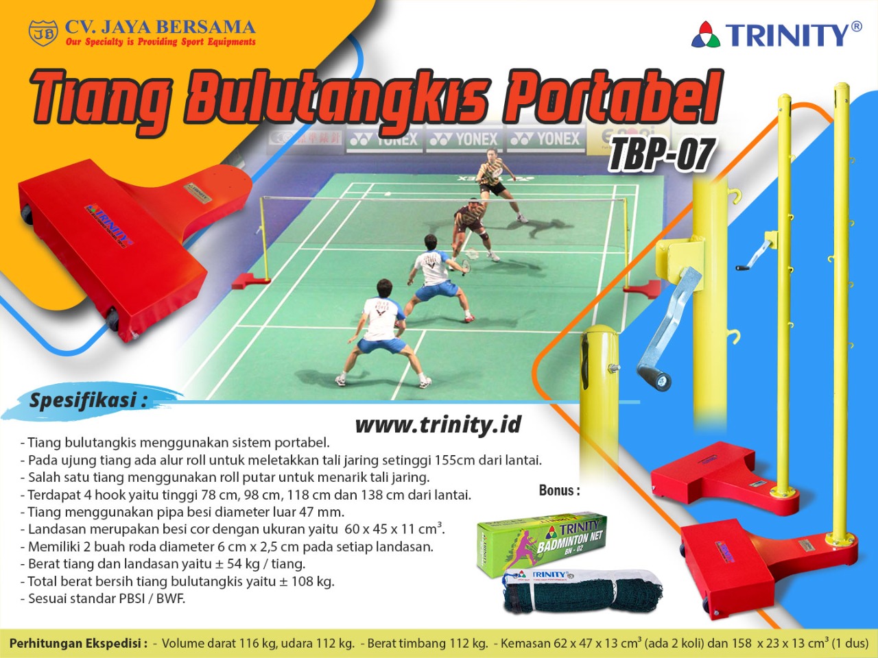 Spesifikasi Tiang Bulutangkis Portabel TBP-07 (Portable Badminton Post) merek Trinity sebagai berikut :