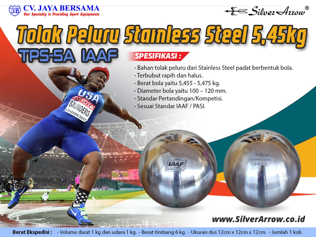 Spesifikasi Tolak Peluru Stainless Steel 5.45kg TPS-5A IAAF merek Silver Arrow sebagai berikut :